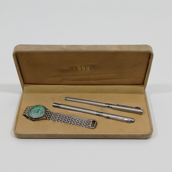 • Conjunto de Presente com 2 Canetas, 1 Esferográfica e 1 Tinteiro E 1 Relógio Feminino, Marca Jinma, Não testado o funcionamento. Medidas da Caixa: Altura: 3 cm, Largura: 10 cm, Comprimento: 22 cm, Peso Total: 300 g.